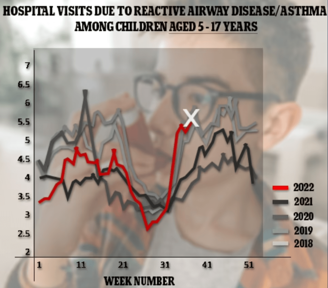 What’s more, separate data from the CDC indicates that hospital visits for those under four years old may be getting worse. For the week ending Sept. 18 of this year, 4.7% of ER visits in the US for toddlers were for breathing difficulties.